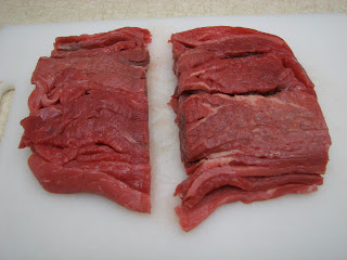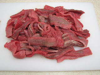 Now, it’s time for the meat. Get yourself some yummy steaks. You’ll have to cut them into strips, which I’ve done in the past, but this time I just bought a package of “stir-fry” meat, so they were already cut into nice thin strips. I just cup them in half, and they were ready to go!