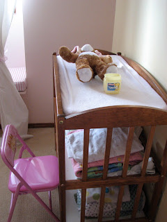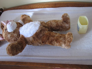 As you can see our two year old lil’ mama has pulled up a chair and gotten busy “cleaning” her bunny’s diaper area with….