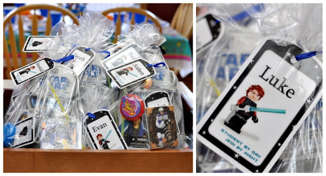 We scored some fun Starwars action figures on clearance at Walmart and then added hockey cards, a glow stick and some candy. But the best part were these cute little personalized Lego Starwars Tags found free here!