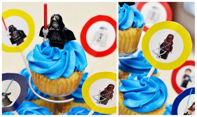 The birthday boy requested cupcakes, which made me very happy because they are so easy! We made them together, pipped on some homemade blue icing (which was a hit at the party because it dyed all the kids teeth blue) and added some StarWars cupcake toppers. Found free here!
