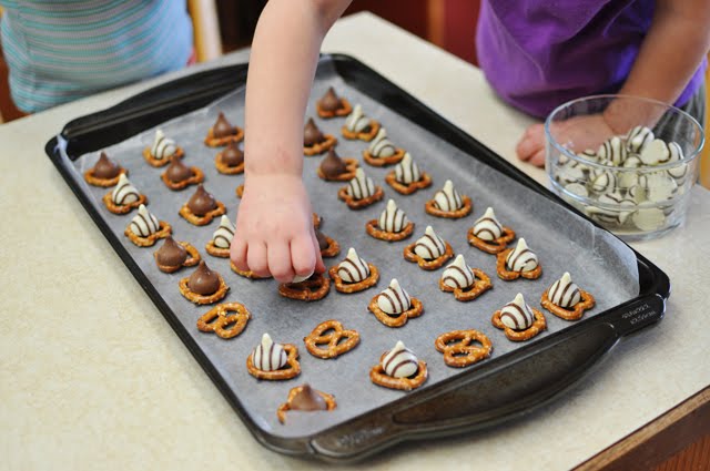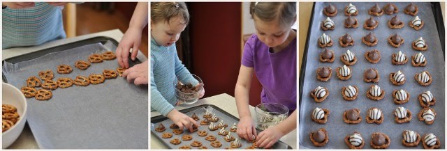 Next they placed their pretzels on their cookie sheet (lined with wax paper) and put a kiss or a hug on top of each one.